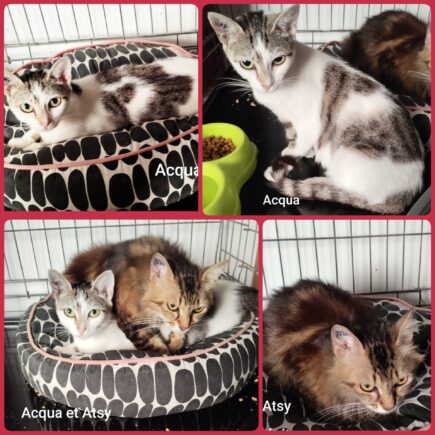 ADOPTEES Ces 2 adorables chatounettes de 2 et 3 ans attendent le foyer aimant qu’elles n’ont pas vraiment eu jusqu’à maintenant. Elles sont super douces et câlines. Vous pouvez les adopter ensemble ou séparément. Elles sont testées, stérilisées, tatouées et vaccinées, il faudra donc prévoir une participation aux frais de 250 € ( Facilités de …