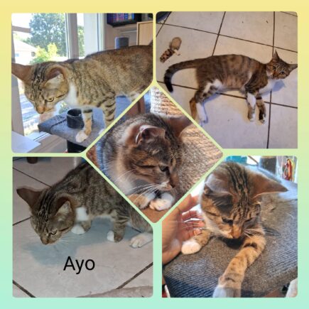 ADOPTÉE Ayo, chatte d’ 1 an / 1an et demi, issue d’un sauvetage. C’est un Amour de chatte ! Douce, calme, câline, boîte à ronrons, elle sollicite beaucoup l’humain pour les caresses et les gratouilles . Le chat idéal. Peut vivre en appartement comme en maison avec jardin. Elle est testée (sida,leucose et teigne), identifiée, …