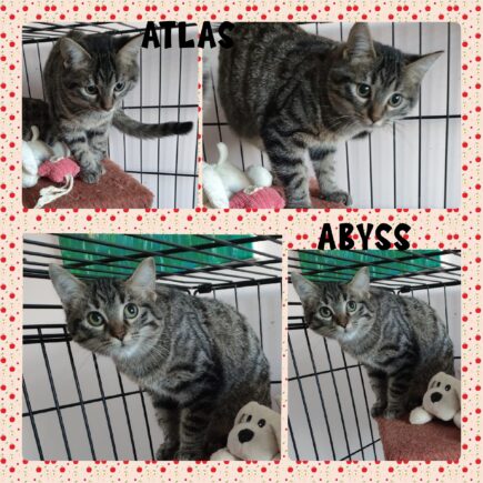 ADOPTÉS Bonjour, nous sommes Atlas et Abyss, nous cherchons une maison pas trop exigeante sur les câlins, au moins de suite, simplement une maison où nous soyons à l’abri de l’hiver qui arrive. Nous ne raffolons pas des caresses mais nous n’avons aucune agressivité. Nous avons environ 4 mois, nous sommes stérilisés et identifiés. Pour …